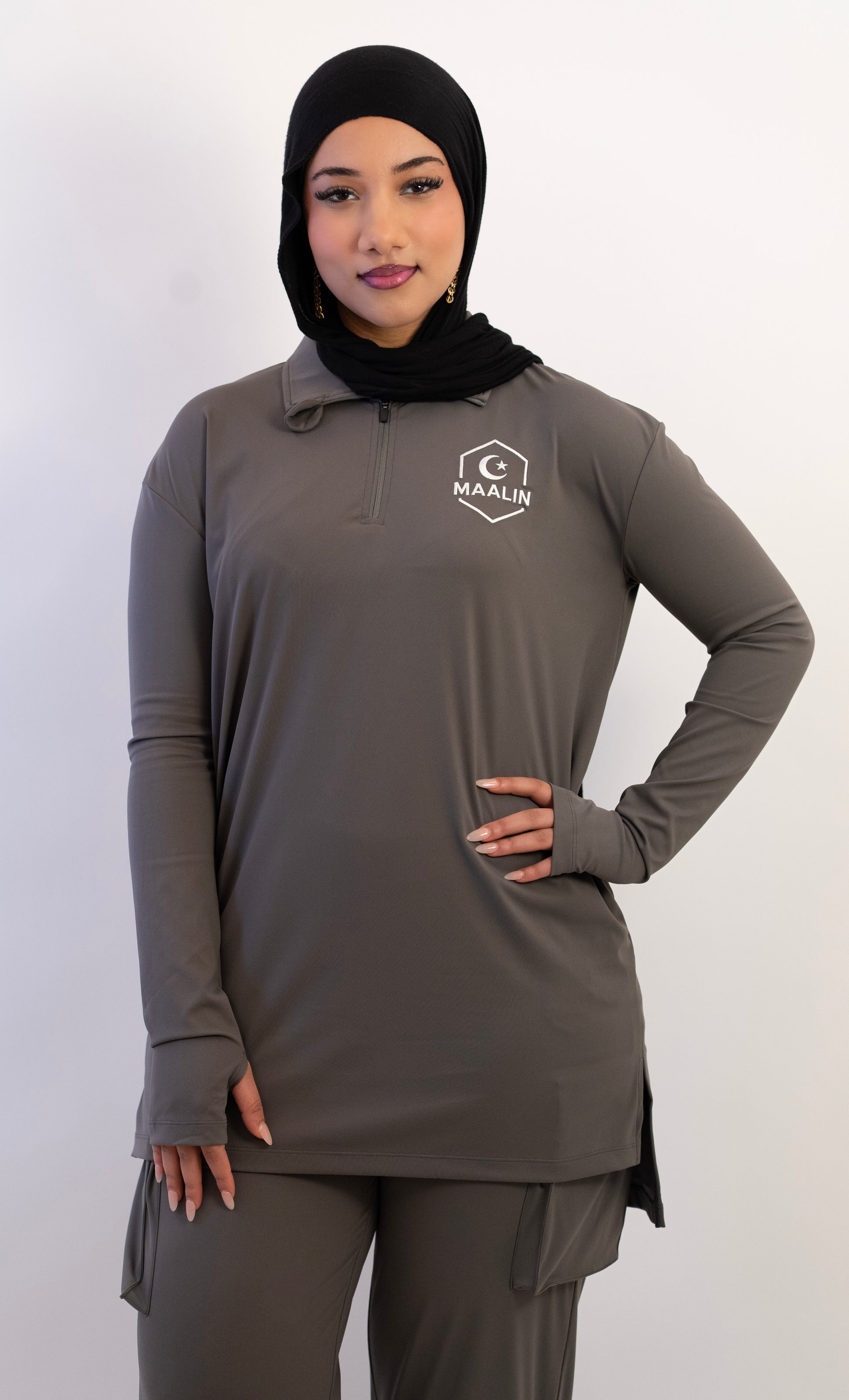 The Essential Zip Top features a full-coverage neckline with a functional zip, thoughtfully placed pockets, and built-in finger holes for ease and warmth. The longer-length silhouette offers extra coverage through the hips and back, making it an effortless go-to for daily wear.
